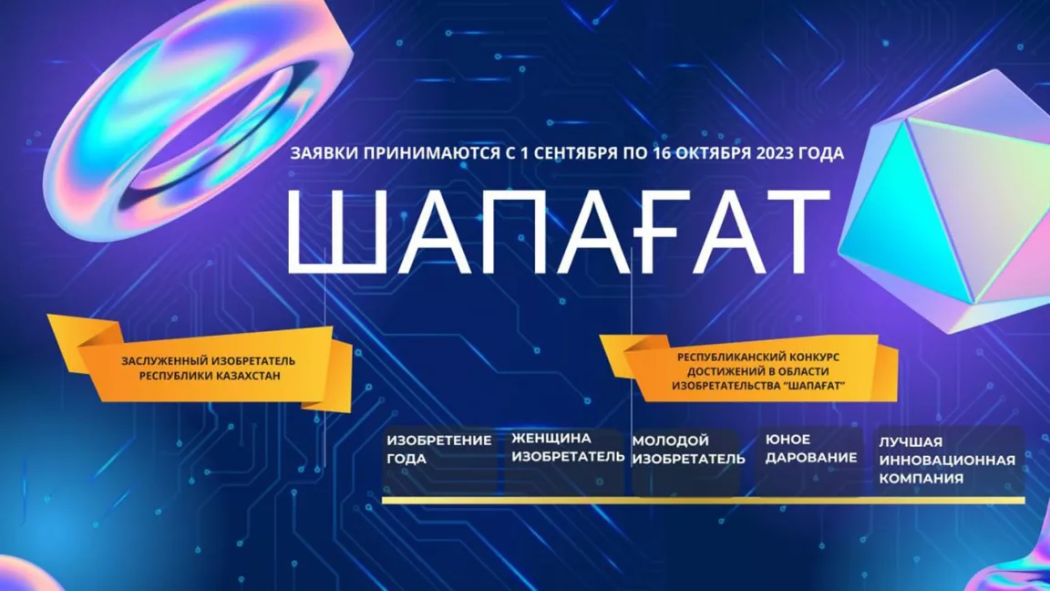 Заявки и ходатайства для участия в Конкурсе «Шапағат» и для присуждения почетного звания «Заслуженный изобретатель Республики Казахстан» принимаются с 1 сентября по 16 октября 2023 года по электронному адресу shapagat@kazpatent.kz.