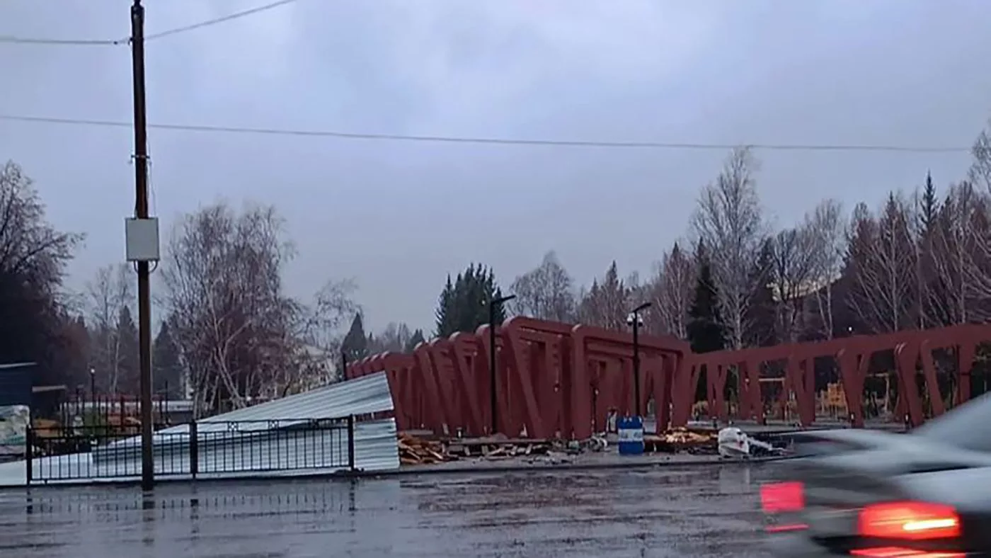 В Риддере, как сообщает информационный портал infor.kz, на площади Республики ветром снесло ограждение.