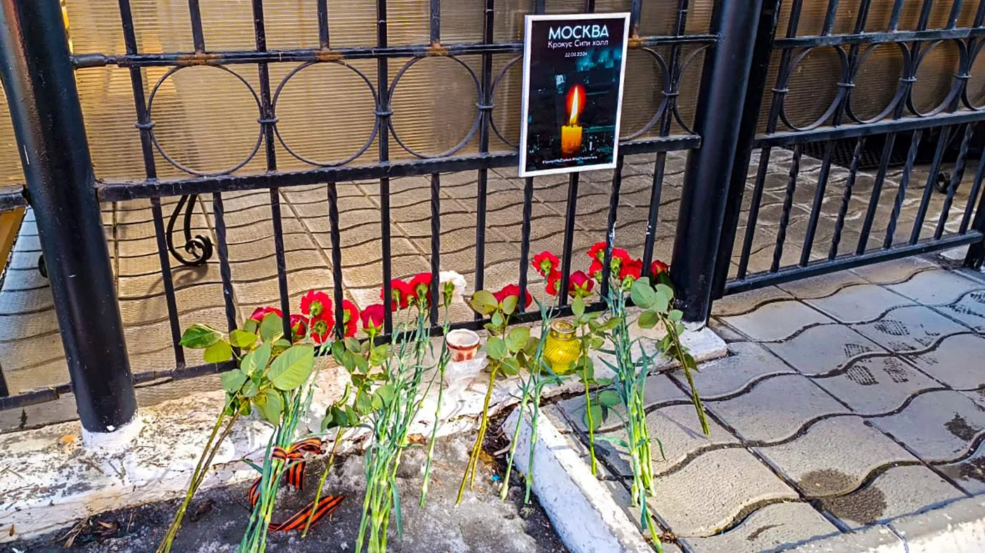 Люди несут цветы к генеральному консульству Российской Федерации в Усть-Каменогорске в память о жертвах теракта в «Крокус сити холле».