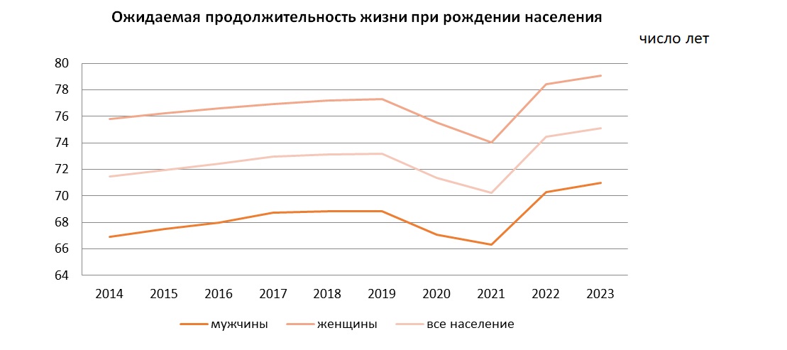 В гендерном разрезе ожидаемая продолжительность жизни женщин также показала рост и составила 79,06лет (2022 г. – 78,4), среди мужчин показатель составил 70,99 лет (2022г. – 70,2лет).