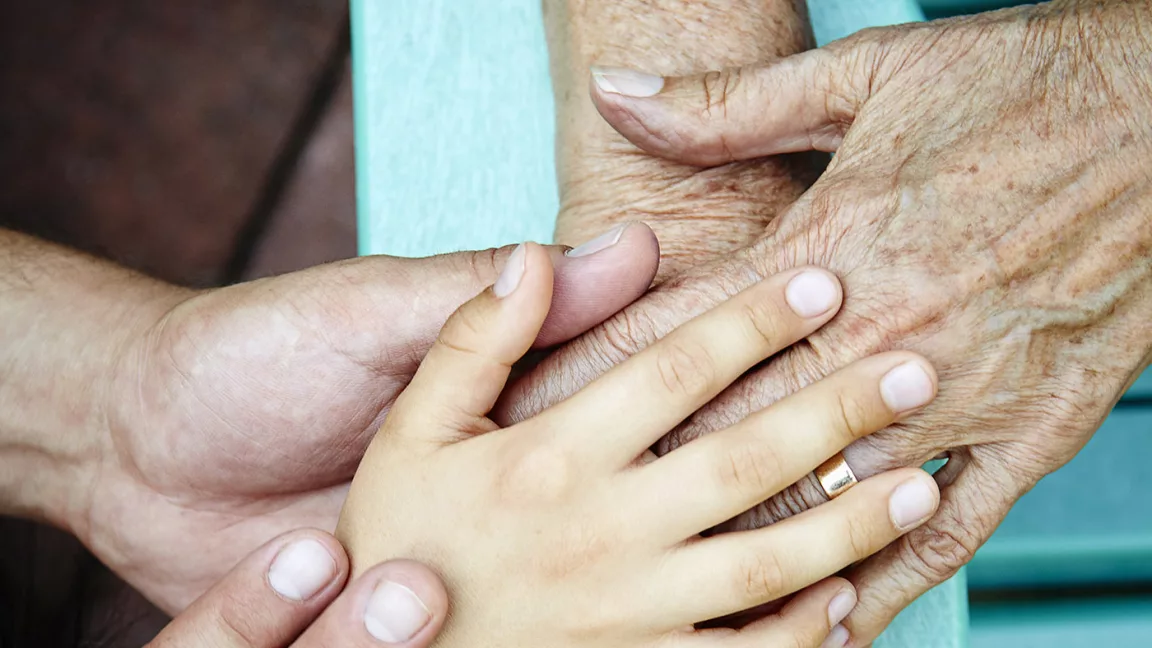 Cropped close up of senior woman, son and grandson hands touching each other in park