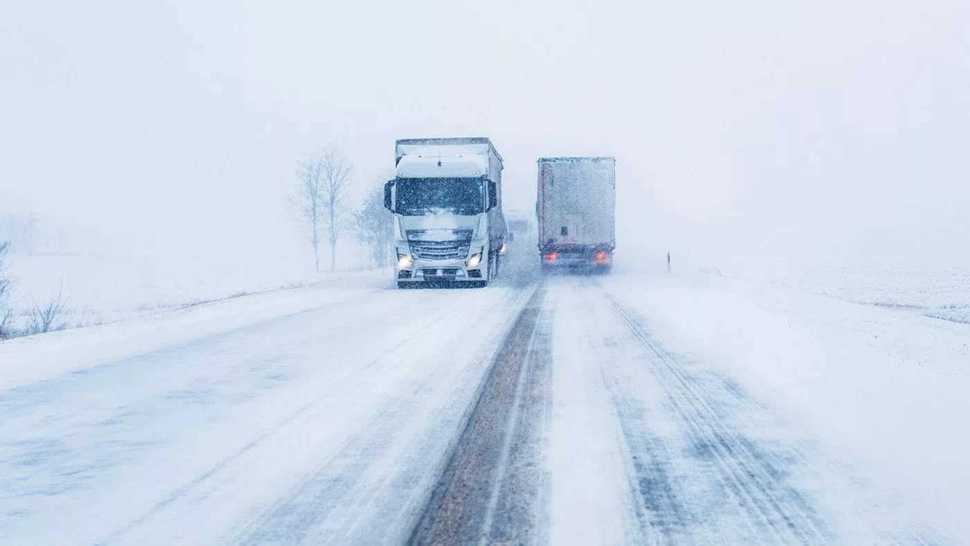 Домой Freight transportation truck on the road in snow storm blizzard Freight transportation truck on the road in snow storm blizzard